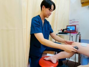 まず、温熱治療や電気治療によって血流を循環させます。そうすることで、手だけではなかなか届かない深い位置にある膝周りの筋肉や組織の緊張をほぐしていきます。